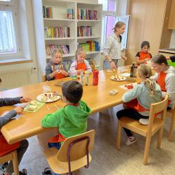 Nun stand jedoch ein besonderes Highlight an: Am 17. September besuchte uns fit4future persönlich und kochte mit allen Kindern ein gesundes Znüni und mit den Schülerinnen und Schülern der 1.-6. Klasse ein leckeres Mittagessen. So lernten die Kinder nicht nur, wie man Gemüsesticks, feine Saucen, Teigwaren "al dente" oder süsse Desserts kocht, sondern übten sich auch im Umgang mit dem Messer, Nahrungsmitteln, Gewichten oder Hohlmassen.
